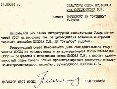 Видимо, посовещавшись с органами в лице ГК КПСС и ВЦСПС, худручка попросила меня оставить тексты с печатями у них, дабы разобраться. Еще месяц с лишним я продержался на работе, получал зарплату, но не репетировал: вход на базу мне был закрыт. Приезжали какие-то люди из МОДСТ, спрашивали, кто мне ставил печати и чья это подпись. На что я, злорадствуя про себя, отвечал, что просто отвез тексты и оставил их у методиста-куратора, а потом приехал и забрал уже с печатями. Потом было затишье, а в начале сентября из Союза советских писателей пришла рецензия на мои песни – вот, оказывается, зачем понадобились худручке мои тексты: по запросу МОДСТ их отправили на экспертизу в Союз писателей СССР! Сам вердикт гласил: стихи написаны плохо и к публичному исполнению их допускать нельзя. Таким образом бюрократическая машина дезавуировала мои печати и штампы, но повод уволить меня по статье исчез: печати-то были и в Доме быта я работал…