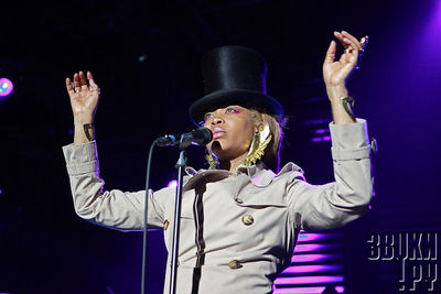 Но вот в импровизированный звуковой бассейн заплывает золотая рыбка Эрика, вокруг ее ушей действительно расположились украшения, похожие на крылышки или плавники. Кажется, у бедняжки проблемы с голосом. Начиная сет, она ставит на пюпитр термос и, слегка подкашливая, берет разгон со свежайшей "20 Feet Fall" - петь артистке явно трудно, и из трех бэк-вокалисток одна сразу начинает помогать ей "вытягивать" основную партию. Надо сказать, последний альбом Эрики очень радует возвращением к истокам соул - причем, на нем есть сразу несколько его разновидностей: от непритязательного "городского романса" "Window Seat" до артистического "Return Of The Ankh". И вся концертная программа, так или иначе, тоже строится на этих вещах, с обязательными обращениями к психоделии типа "Out My Mind" (в которой, правда, очень неудачно выведен вперед бас, и клавиши режут слух). Новая программа поражает мягкостью и какой-то расслабленной негой - ничего общего с агрессивной первой частью диптиха - "4th World War". Подавляющее большинство песен - о любви и всех ее проявлениях; при этом в "Love Of My Life" и "No Love" зал легко и с воодушевлением пропевает довольно сложные партии.