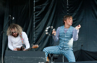 "Мумий Тролль", между тем, играет в расширенном составе – позади гитариста Юрий Цалера стоит высоченный петербуржец Феликс Бондарев (Red Samara Automobile Club и прочее), отвечающий за некоторые гитарные партии и клавишные. Он невозмутим, а может, и смущен. Илья Лагутенко отвечает на вопрос о нем коротко: "Попросился – хочу, мол, постоять". Сам герой прыгает, аки шут, по сцене, выделывая разнообразные коленца и выпевая хиты из разных эпох: "Шамаманы", "Делай меня точно", "Утекай", "Медведица". Цыганский рок-н-ролл. И традиционная уже длинная "Поспи, рок-н-ролл". С каждым разом непонятно, в чем ее суть – в том, что МТ могут играть долго и громко несколько аккордов? В надцатый раз она не производит никакого впечатления.