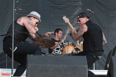 Каждый музыкант – архетип крутости. Татуировки, кожа, черный цвет. Две голосистые бэк-вокалистки, придающие песням неимоверную крутость, гитаристка-клавишница, басистка, просто клавишник, барабанщик. Плантообразный гитарист Джастин Деррико (Justin Derrico) играет, похоже, главные роли – и как исполнитель самых задорных риффов, и как объект заигрываний.