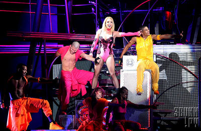 Однако шоу «Femme Fatale», к сожалению, никакое не новаторское, как обещал сам Кинг. Это, скорее, greatest hits Джейми — все элементы нынешнего шоу мы уже видели. Быстрые пробеги по металлическим конструкциям с элементами паркура, которые происходят в первой части шоу (а-ля «побег из тюрьмы») — были использованы в рамках «Confession Tour» Мадонны. Египетская тематика с циклопической солнечно ладьей, из которой на сцену вылезают танцоры, была задействована в «Livin’ la Vida Loca Tour» Рики Мартина и, судя по всему, появится в трибьют-шоу Cirque Du Soleil. Ну а байкерская эстетика, равно как и образ роковой женщины, нечто среднее между Мэрилин Монро и Марлен Дитрих — пожалуйте в «Back to Basics Tour» Кристины Агилеры. Даже публику Агилера вытаскивала на сцену, так что коллективные пляски с фанатами из первых рядов в «I Wanna Go» — тоже повторение пройденного.