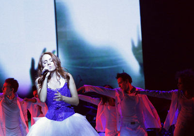 МакSим собирала "Олимпийский" четыре года назад (пусть и не весь, но это площадка явно не для рядовых артистов), в тот день собрать Крокус, скажем так, не получилось. На сцене и по бокам - экраны, по которым идут видеовставки и видеоклипы. Аккомпанирующий состав - классический, плюс две бэк-вокалистки и саксофонист-трубач (во время исполнения пронзительного проигрыша на трубе из песни "Научусь летать" мурашки бегали по коже). В некоторых песнях певица берется за гитару сама.