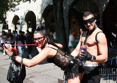 А посреди центральной улицы разгуливает ребенок в костюме pussy. В какой-то момент его подхватила на руки женщина в полицейской форме, и мы даже решили, что женщина сейчас отнесет ребенка в участток - но потом пригляделись и поняли, что у дамы-полисмена наручники отделаны мехом кролика. |