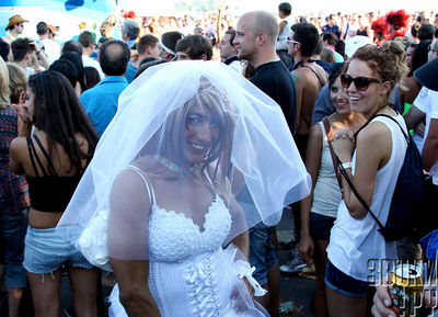 Стартует Парад - и на сцене разогрева под названием Utoquai заряжает свой сет Ферри Корстен (Ferry Corsten), а на улицах появляются огромные передвижные дискотеки. На некоторых платформах расположились филиалы стрип-клубов. Над головами зрителей проплывают show girls в соблазнительных позах. |
