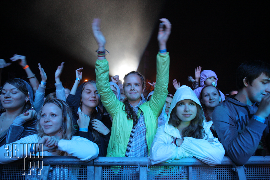 Свет деликатный и мягкий, дистанция между публикой и сценой - минимальная. Дождь идет, не переставая, но люди идут и идут на площадку, и в результате уже к середине дня перед сценами пляiет приличного размера толпа.