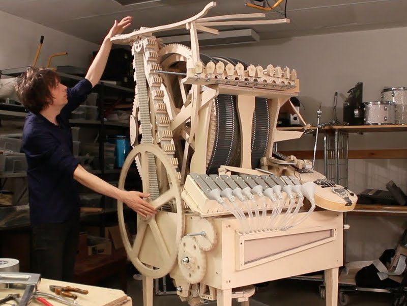 Шведский музыкант Мартин Молин (Martin Molin) придумал инструмент, который уместнее всего назвать аналоговым сэмплером и драм машиной. В её основу положен принцип замкнутой системы, в которой колесо со специальными насадками извлекает звуки из вибрафона и бас-гитары, а передвигающиеся по канавкам 2 тысячи металлических шариков создают ритмическую партию. Инструмент на видео выглядит довольно "прилизанным", но пытливый глаз заметит некоторые огрехи конструкции вроде постоянно падающих шариков. К тому же, звук с микрофонов Молин затем тщательно обрабатывал, чтобы избавить музыку от утечки шумов, создаваемых конструкцией.
